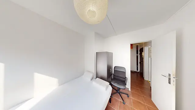 La colocation possède 4 chambres, une pièce de vie et une cuisine ouverte sur salon. Ce dernier est meublé avec canapé, fauteuil, table basse, TV et meuble TV.