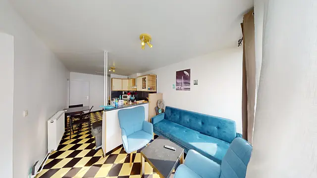La colocation possède 4 chambres, une pièce de vie et une cuisine ouverte sur salon. Ce dernier est meublé avec canapé, fauteuil, table basse, TV et meuble TV.