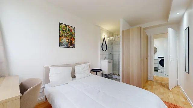 Idéale pour plus d’intimité, cette chambre dispose d’une salle d’eau privative avec douche et vasque. Elle comprend également un lit double, un bureau, une chaise, un placard et un miroir mural, le tout dans une ambiance lumineuse et apaisante.
