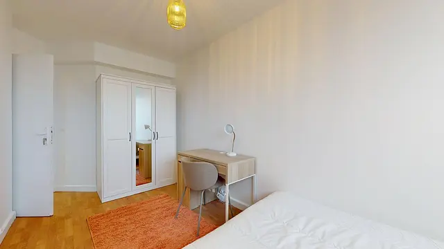 Cette chambre comprend un lit double, un bureau avec lampe, une chaise confortable et une grande armoire avec miroir. La décoration claire et les touches orangées apportent une atmosphère douce et chaleureuse.