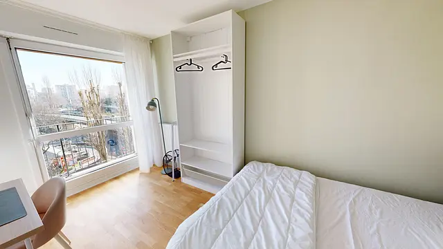La chambre est lumineuse et agréable, offrant un cadre confortable. Elle est équipée d'un lit double, d'un placard de rangement, d'un bureau et d'une lampe pour une ambiance pratique et agréable.