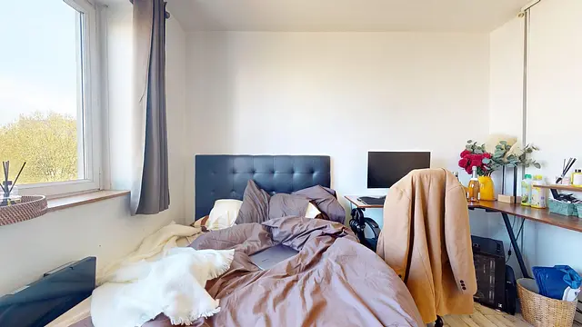 Cette colocation comprend donc 4 chambres équipées avec des lits doubles, des bureaux, des chaises et des rangements. Certaines des chambres comporte des fauteuils.