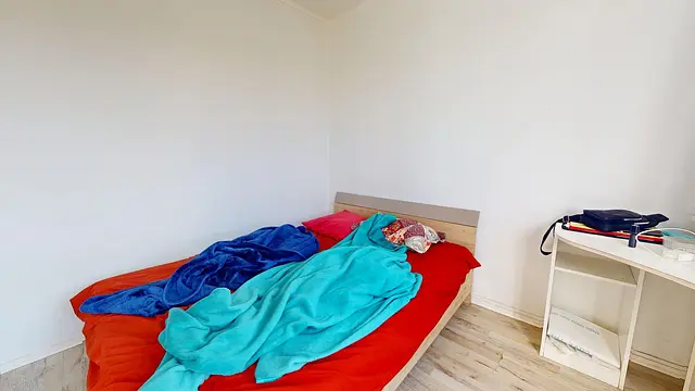 Cette colocation comprend donc 4 chambres équipées avec des lits doubles, des bureaux, des chaises et des rangements. Certaines des chambres comporte des fauteuils.