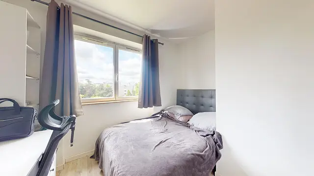 Cette colocation comprend donc 4 chambres équipées avec des lits doubles, des bureaux, des chaises et des rangements. Certaines des chambres comporte des fauteuils.