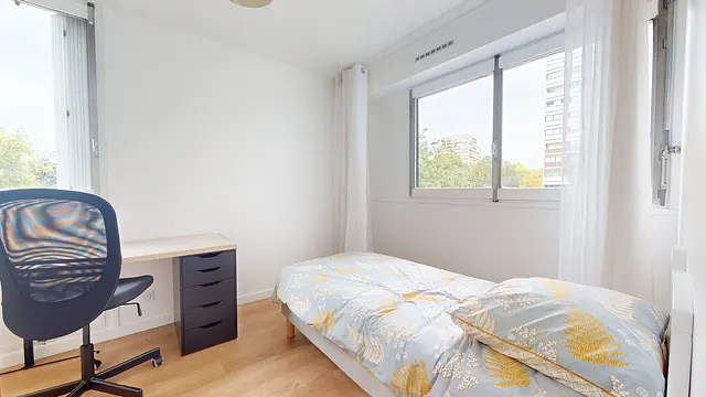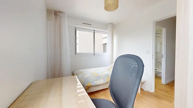 La chambre est équipée d’un lit simple, d’un bureau et d’un placard de rangement.