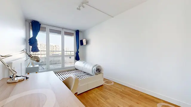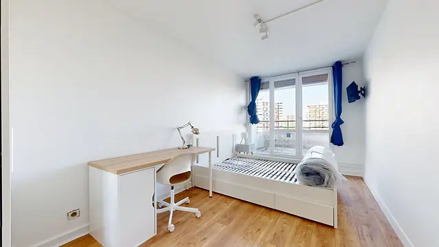 La chambre est équipée d'un bureau, d'un lit double, d'un chevet et d'une penderie. Accès à un balcon privatif.
