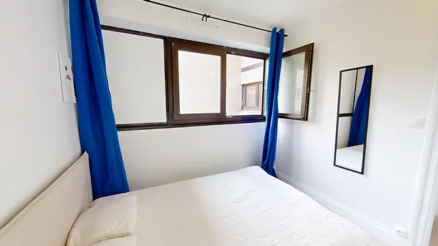 Elle est équipée d'un lit double, bureau, miroir de plein pied et penderie.