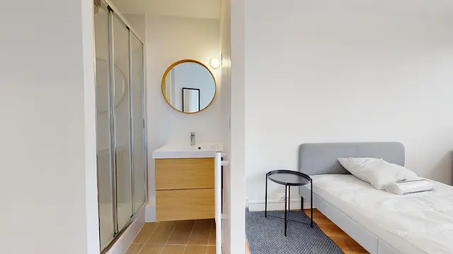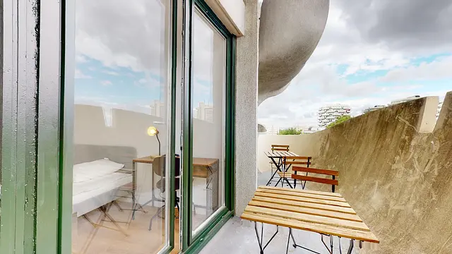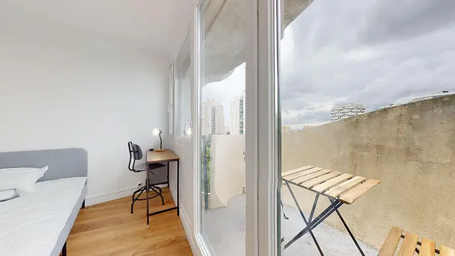 Chaque chambre de la colocation dispose d’un accès direct au balcon et partage les espaces communs déjà meublés et équipés, idéals pour une vie collective harmonieuse.