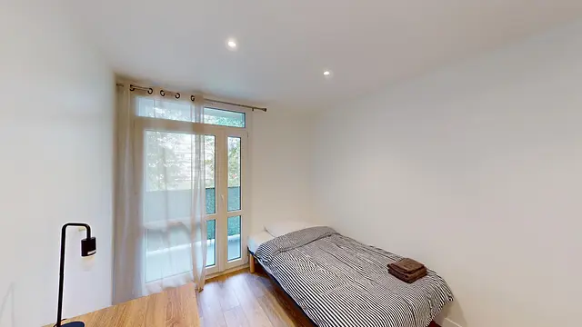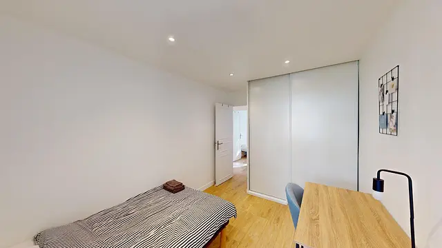 La colocation se compose de 4 chambres d’environ 10 m². Dans chacune des chambres, vous disposez d'un lit 120 cm, une armoire, un bureau avec chaise et des rangements. Deux des chambres ont accès à un balcon qui est aussi accessible depuis le séjour.
