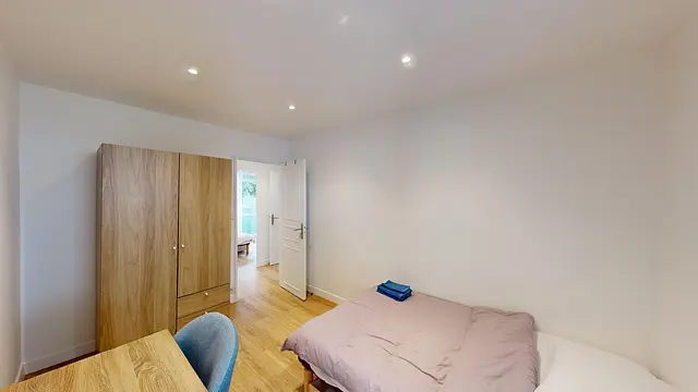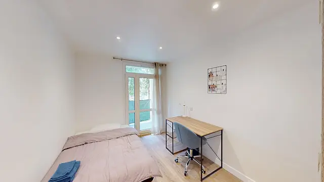 La colocation se compose de 4 chambres d’environ 10 m². Dans chacune des chambres, vous disposez d'un lit 120 cm, une armoire, un bureau avec chaise et des rangements. Deux des chambres ont accès à un balcon qui est aussi accessible depuis le séjour.