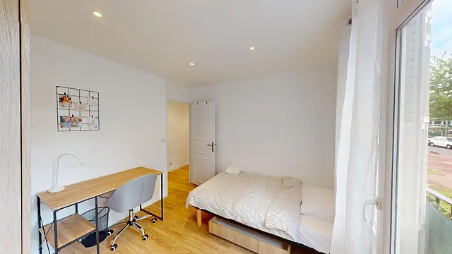 La colocation se compose de 4 chambres d’environ 10 m². Dans chacune des chambres, vous disposez d'un lit 120 cm, une armoire, un bureau avec chaise et des rangements. Deux des chambres ont accès à un balcon qui est aussi accessible depuis le séjour.
