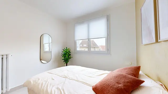 Aménagée avec un lit double, un bureau, une chaise, un placard et un miroir, cette chambre lumineuse bénéficie également d’un accès à la salle de bains et aux toilettes communes avec deux autres chambres.