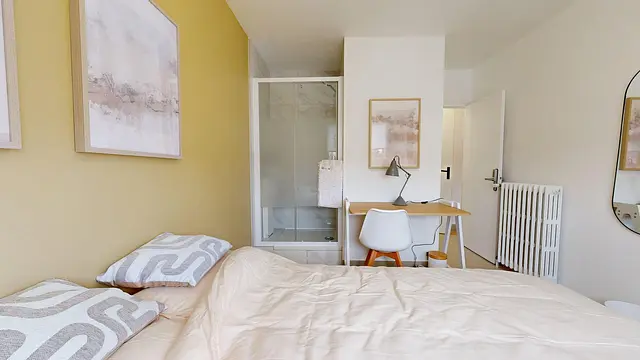 Aménagée avec un lit double, un bureau, une chaise, un placard et un miroir, cette chambre lumineuse bénéficie de sa propre douche privatifs.