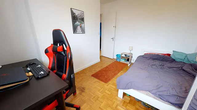 La chambre 3 de 10m2 est située en face de l’entrée. Cette chambre est équipée : d’un lit double, d’un bureau, d’une chaise et d’un placard de rangement.