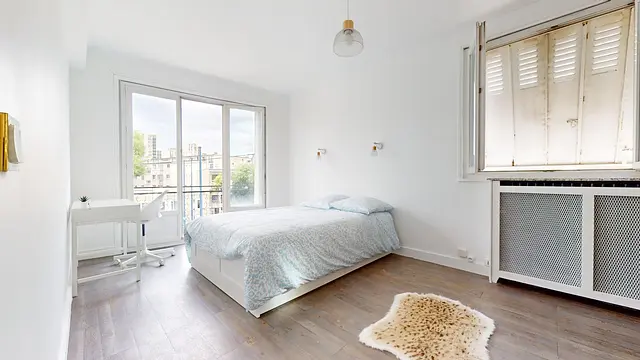 Cette chambre dispose d'un lit double, d'un bureau et de rangements. Elle permet l'accès à un balcon partagé avec le locataire de la chambre 2 pour un supplément d'espace extérieur.
