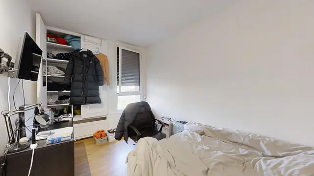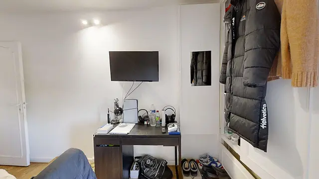 Cette colocation de quatre chambres s'ouvre sur un salon aménagé d'un canapé, d'un meuble TV avec une télévision ainsi que d'un meuble de rangements.