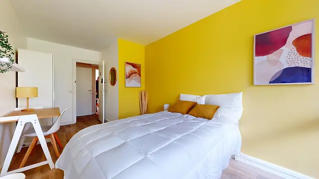 Grande chambre avec balcon privatif : l’une des plus spacieuses de la colocation, entièrement meublée avec lit double, bureau, placard, et surtout un balcon privatif aménagé offrant une vue dégagée sur la verdure. Un vrai plus rare en colocation, idéale pour profiter d’un espace lumineux et confortable au quotidien.
