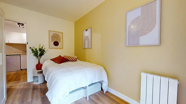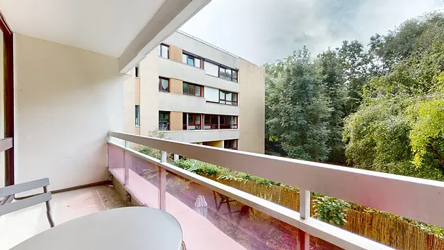 Chambre confortable et luminosité avec balcon partagé. Cette chambre cosy offre un espace bien pensé avec lit confortable, bureau et armoire de rangement. Grâce à sa grande baie vitrée, la pièce est baignée de lumière naturelle et s’ouvre directement sur un balcon partagé. Un lieu idéal pour travailler au calme et profiter d’un extérieur verdoyant.