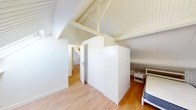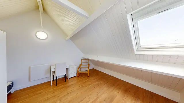 Située sous les toits, cette chambre mansardée offre un plus grand espace de vie particulièrement agréable. Elle bénéficie d'une belle luminosité grâce à son Velux. La chambre est équipée d'un lit double et dispose de tout le mobilier nécessaire, incluant des rangements et un bureau fonctionnel pour travailler dans les meilleures conditions.