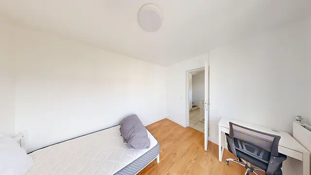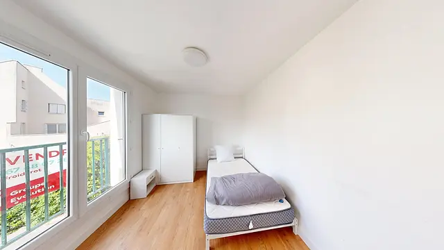 Située au premier étage, cette chambre bénéficie d'une luminosité exceptionnelle grâce à sa grande fenêtre. Elle est équipée d'un lit en 120 cm de large. Vous disposerez également d'un grand placard de rangement intégré pour organiser facilement toutes vos affaires personnelles, ainsi que d'un bureau fonctionnel pour travailler dans les meilleures conditions.