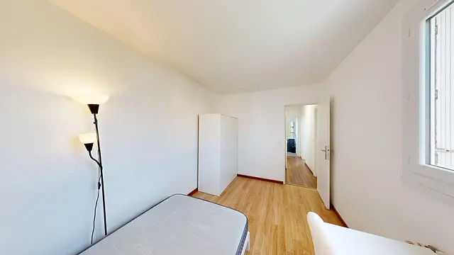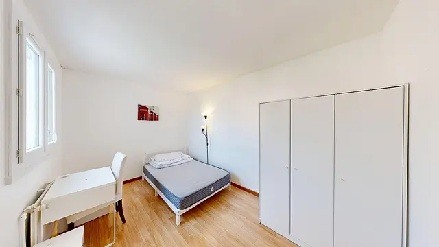 Cette chambre lumineuse du 1er étage dispose d'une grande fenêtre apportant une belle luminosité. Elle est équipée d'un grand placard de rangement intégré avec portes coulissantes blanches. Le sol est revêtu d'un parquet flottant clair. Côté mobilier, la pièce comprend un lit double et son matelas, un bureau avec chaise.