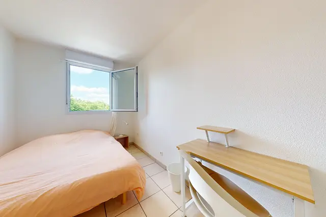 Elle comporte un lit double, bureau, table de chevet, et penderie de rangement.