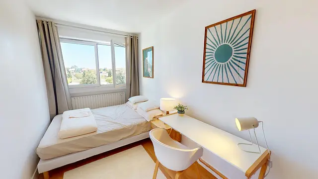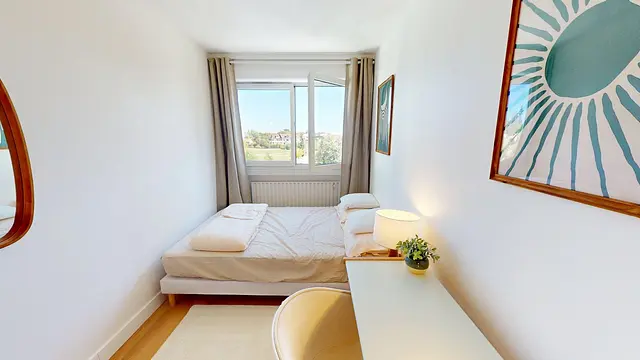 Aménagée avec soin, cette chambre comprend un lit double, un bureau et des rangements. Lumineuse grâce à sa grande fenêtre, elle offre un espace de travail agréable et fonctionnel.