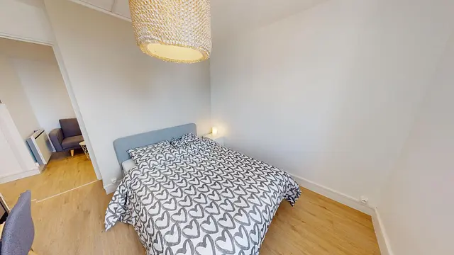 Cette chambre de 10m2 dispose d'un lit double, une table de chevet avec lampe, un bureau rangement avec une chaise et un grand placard mural.