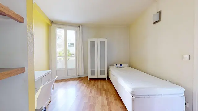 Cette chambre se compose d'un lit double, d'un bureau accompagné d'une table et d'une chaise et d'une armoire de rangement. Un balcon vient compéter cet espace.
