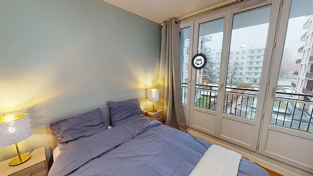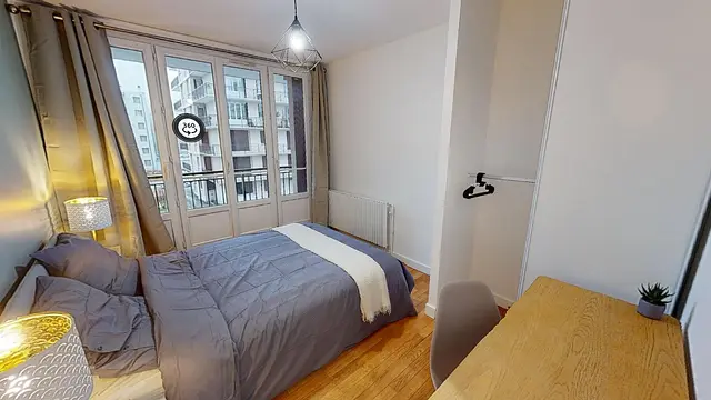 Cette lumineuse chambre de 10,7m2 comporte un grand placard mural, un lit double, deux tables basses avec lampes, un bureau avec sa chaise et plusieurs éléments de décoration. Cette chambre a un accès direct sur le balcon.