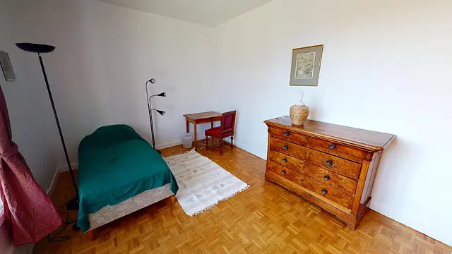 La chambre 3, très spacieuse, de 15 m2, donne également l’accès à un balcon privatif ensoleillé l’après-midi. Elle se compose d’un lit double (il a été changé après que la visite virtuelle a été réalisée), d’un bureau, d’un fauteuil et d’une commode à tiroir.