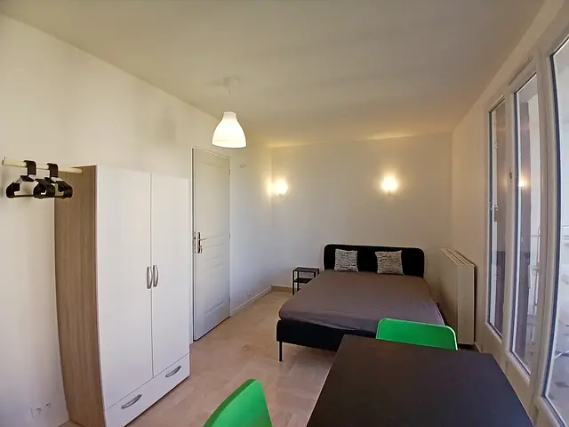 - Séjour lumineux : un salon chaleureux aménagé avec un canapé, un fauteuil et une grande table à manger, idéal pour partager des repas ou des moments de détente entre colocataires.