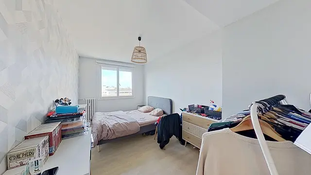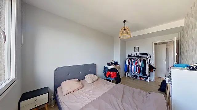 Cette chambre dispose d'un lit double, d'un espace de travail fonctionnel avec bureau et chaise, ainsi que d'une grande penderie pour vos rangements. La pièce bénéficie d'une belle luminosité naturelle, offrant un cadre de vie agréable et chaleureux. Lors de la visite virtuelle un locataire était en place, la penderie et le meuble ne seront pas donc pas présent lors de votre entrée.