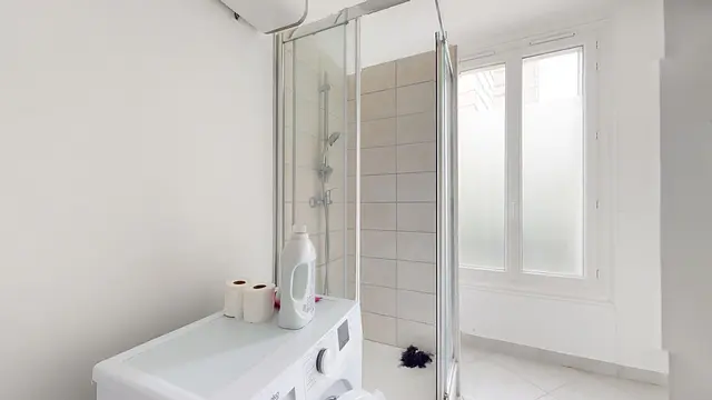 La chambre dispose d'un lit double, d'un bureau avec une chaise, d'un fauteuil et de rangements. Elle comporte également sa propre salle d'eau lumineuse et privative équipée d'une cabine de douche, une machine à laver ainsi qu'un meuble vasque et un sèche serviette.