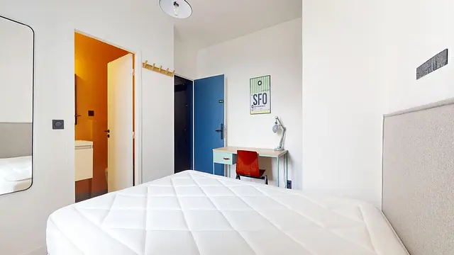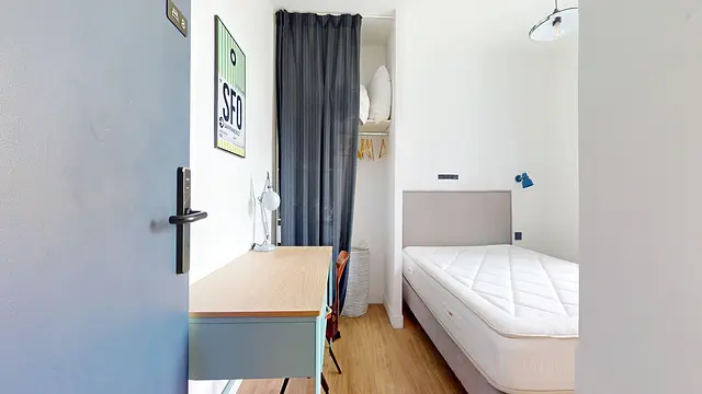 Cette chambre dispose d'un lit double de qualité, d'un espace de travail complet avec bureau et chaise, ainsi que d'un aménagement dédié pour ranger vos vêtements, incluant une penderie avec cintres.