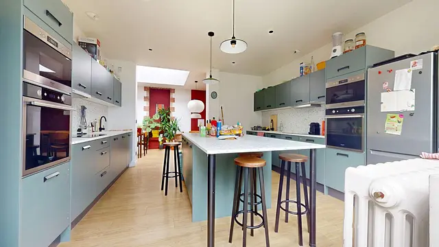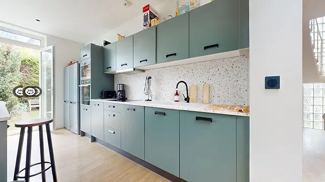 La maison s'organise autour d'un rez-de-chaussée spacieux et lumineux. La cuisine ouverte, entièrement équipée avec quatre réfrigérateurs, deux fours, deux plaques de cuisson et deux micro-ondes, donne sur une vaste salle à manger. Cet espace convivial est aménagé avec deux grandes tables de réception, de nombreuses chaises et une décoration soignée intégrant de belles plantes vertes. Pour les moments de loisirs, le coliving dispose de plusieurs salles de détente incluant des jeux d'arcade, un espace télévision et une table de ping-pong. La maison compte quatorze chambres, chacune disposant de sa propre salle de bain privative pour un maximum de confort. Côté logistique, une buanderie avec deux lave-linge et deux sèche-linge est à votre disposition, et un service de ménage assure l'entretien régulier des parties communes.