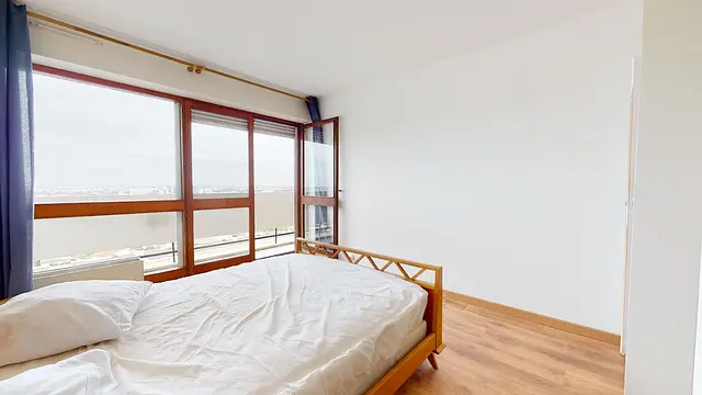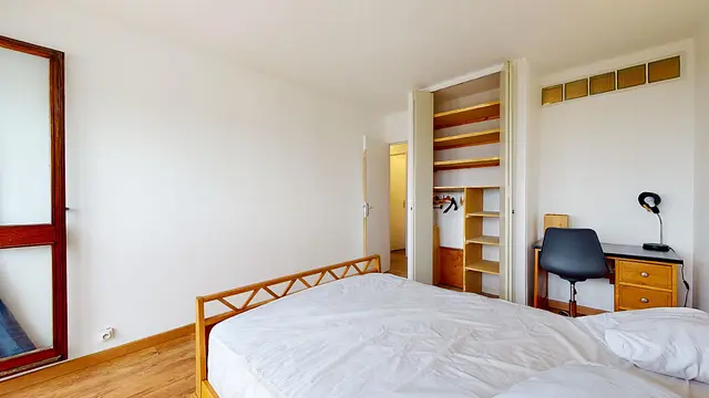 Cette grande chambre dispose d'un lit double, une table de chevet, un grand placard mural ainsi qu'un bureau avec une chaise et une lampe. Cette chambre a un accès direct sur un balcon avec une vue dégagée.
