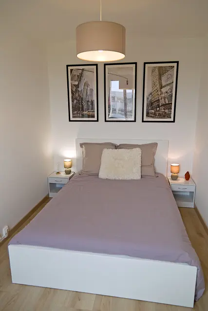 La chambre 3 dispose d’un lit double, de deux tables basses et ses lampes de chevet associées, d’un bureau et de sa chaise, et enfin d’un grand meuble de rangement.