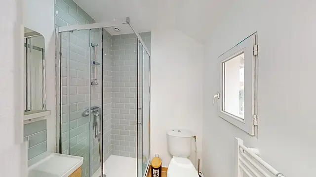 La chambre possède sa salle de bain (douche, meuble vasque, sèche-serviette) et WC privatif. Elle est agréablement décorée et meublée avec bureau, lit double, armoire et commode de chevet.