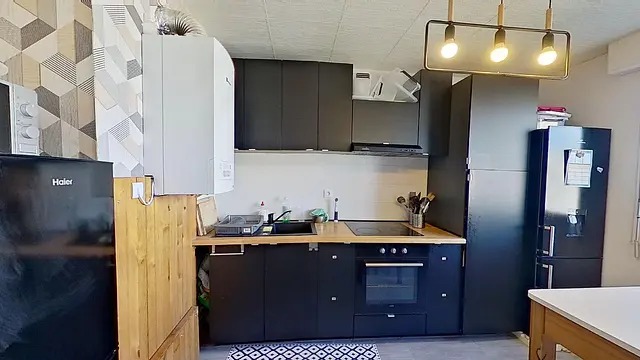 L’entrée de l’appartement s’ouvre sur un espace salon muni de son canapé et de et ses tables basses. La cuisine est intégrée et s’équipe d’un four, d’une hotte, de 4 plaques électriques, d’un micro-onde, de plusieurs placards et de 2 grands frigidaires. Une table haute est à la disposition des locataires avec ses 4 tabourets.