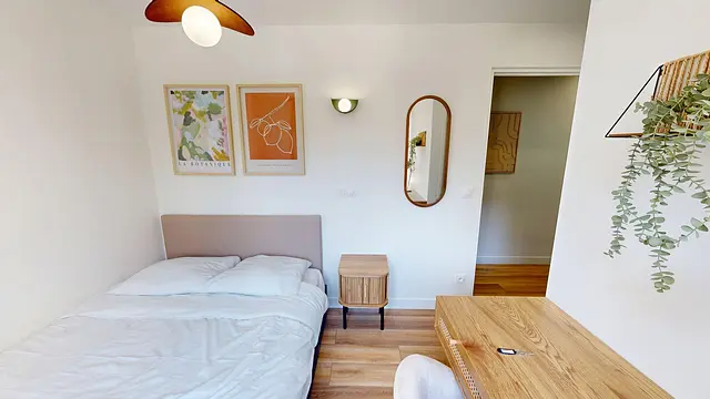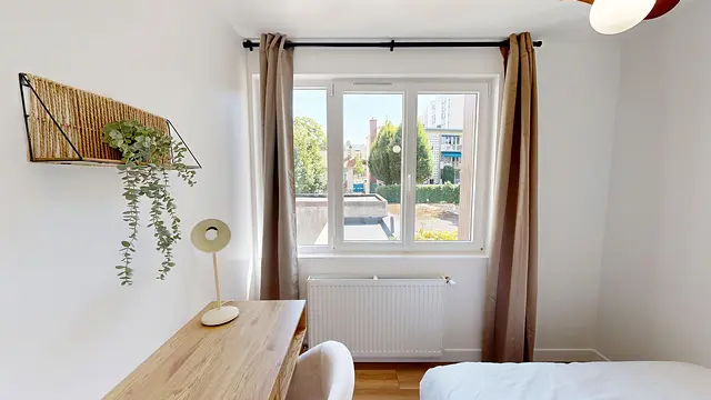 - Séjour lumineux : canapé confortable et coin repas adaptés à la vie en colocation.