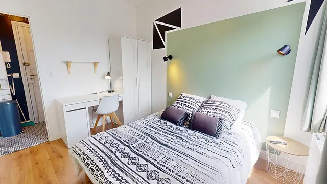 La chambre est équipée d'un lit double, un bureau, un placard de rangement, une télévision et une commode de chevet.