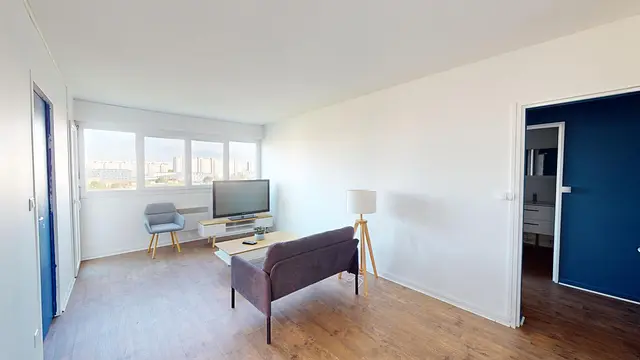 L'appartement s'ouvre sur une entrée desservant un lumineux séjour. Celui-ci dispose d'un canapé (voir canapé clair, dernière photo), d'un fauteuil et d'une table basse et d'un meuble TV avec TV.