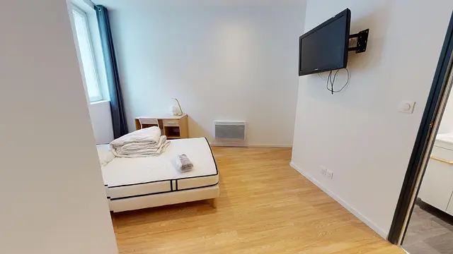 Cette chambre est équipée d’un lit double, d’un bureau, d’une chaise et de rangement.