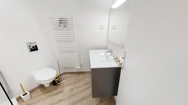 La chambre 5 au 2ème étage est aménagée avec un lit double (140 x 190 cm), un meuble de rangement, un bureau et une chaise, une télévision individuelle, et une salle de bain comprenant une douche, un WC et un meuble vasque.