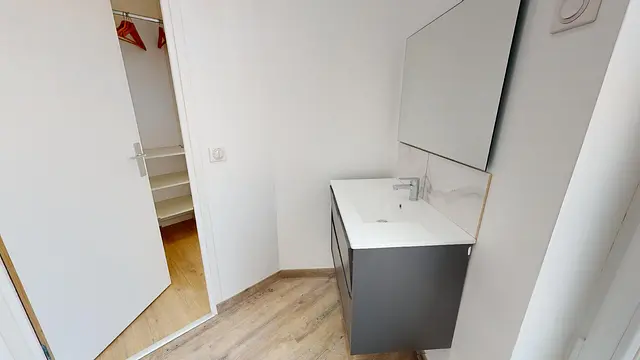 La grande chambre 3 est aménagée avec un lit double (140 x 190 cm), un meuble de rangement, un bureau et une chaise et une télévision individuelle. Le plus : une grande salle de bain comprenant une douche, un WC et un meuble vasque.
