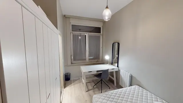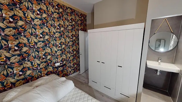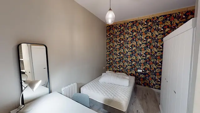 La chambre 1 se compose d'un lit double, d'un grand placard, de rangement, d'un bureau, d'une chaise de bureau, d'une lampe de bureau, ainsi que d'une salle d'eau munie de sa douche et de son évier.