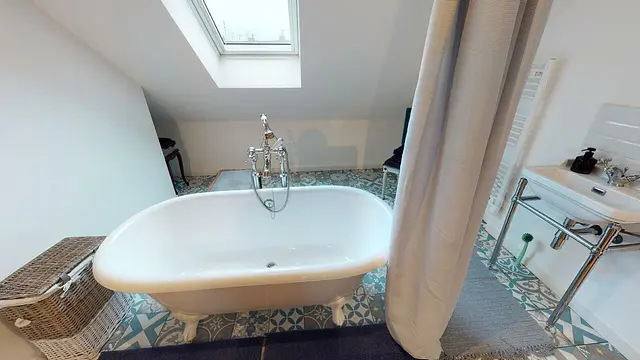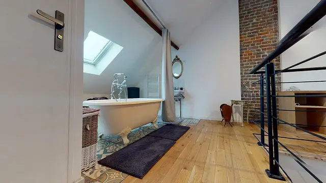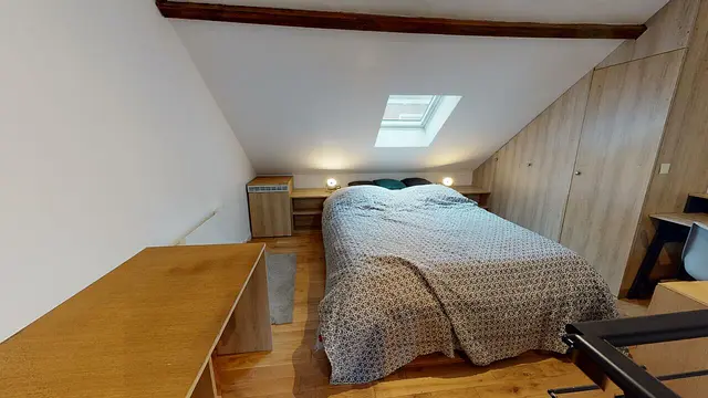 La dernière chambre de cette colocation située au dernier étage est équipée d'un lit double, d'un bureau et de rangements. Une grande salle de bain privative se trouve dans la même pièce composée d'une baignoire d'un meuble vasque.
