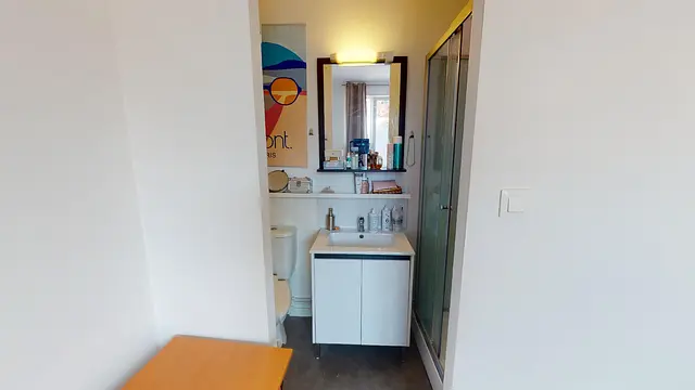 Le 2ème étage comporte également 2 chambres ainsi que la salle de bain commune de la colocation avec meuble vasque, cabine de douche et WC.