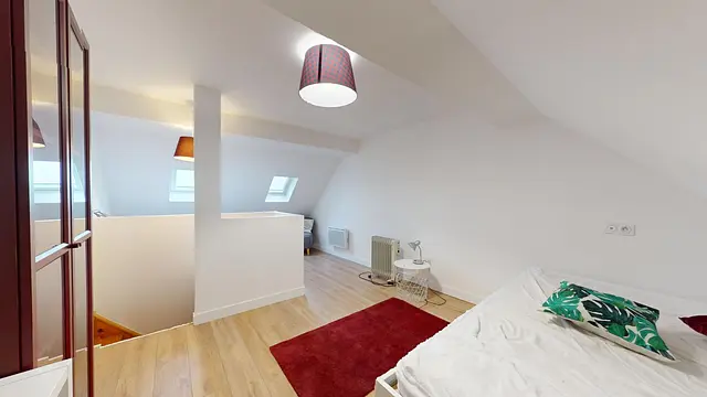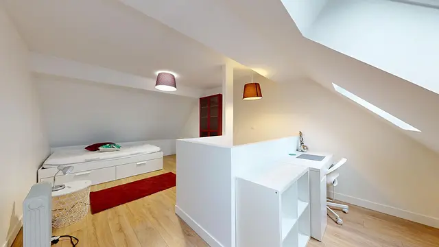 Cette chambre, située au 3ᵉ étage, est équipée d'un bureau, un fauteuil, d'un lit double, d'étagères et de rangements. Cette chambre est particulièrement lumineuse grâce à deux velux.